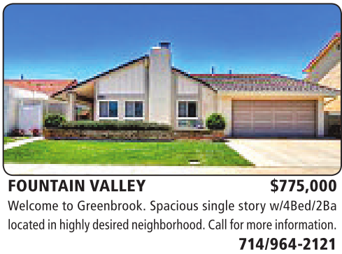 FOUNTAIN VALLEY $775,000 Welcome to Greenbrook. Spacious single story w/4Bed/2Ba locatedinhighlydesired neighborhood. Call formore information.