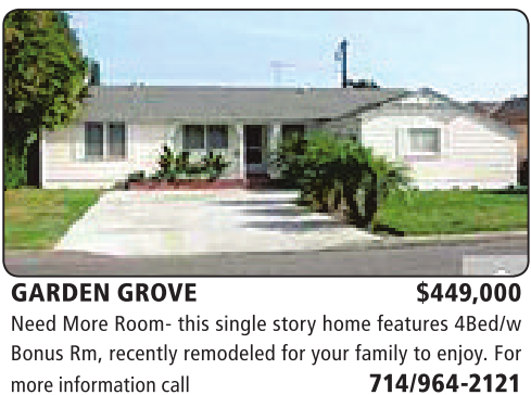GARDEN GROVE $449,000 Need More Room- this single story home features 4Bed/w Bonus Rm, recently remodeled for your family to enjoy. For more informationcall 714/964-2121
