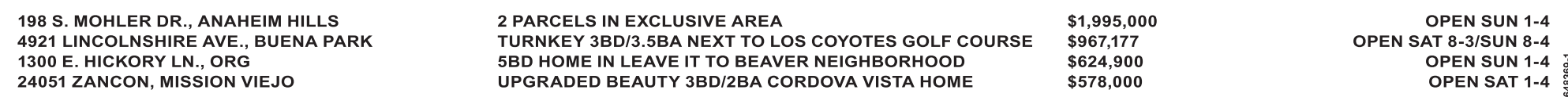 198 S. MOHLER DR., ANAHEIM HILLS 2 PARCELS IN EXCLUSIVE AREA $1,995,000 OPEN SUN 1-4 4921 LINCOLNSHIRE AVE., BUENA PARK TURNKEY 3BD/3.5BA NEXT TO LOS COYOTES GOLF COURSE $967,177 OPEN SAT 8-3/SUN 8-4 1300 E. HICKORY LN., ORG 5BD HOME IN LEAVE IT TO BEAVER NEIGHBORHOOD $624,900 OPEN SUN 1-4 24051 ZANCON, MISSION VIEJO UPGRADED BEAUTY 3BD/2BA CORDOVA VISTA HOME $578,000 OPEN SAT 1-4
