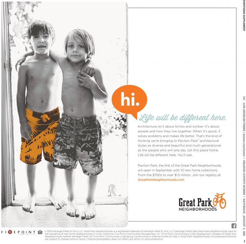 Life will be different here. Architecture isn’t about bricks and lumber. It’s about people and how they live together. When it’s good, it solves problems and makes life better. That’s the kind of thinking we’re bringing to Pavilion Park: SM architectural styles as diverse and beautiful and multi-generational as the people who will one day call this place home. Life will be different here. You’ll see. Pavilion Park, the first of the Great Park Neighborhoods, will open in September with 10 new home collections. From the $700s to over $1.5 million. Join our registry at GreatParkNeighborhoods.com ©2013 Heritage Fields El Toro,LLC.Great Park Neighborhoods is aregisteredtrademark of Heritage Fields El Toro,LLC (Heritage Fields)dba Great Park Neighborhoods used for the marketing of new home neighborhoods in Irvine, California. Five Point Communities Management, Inc. (Five Point Communities) isthe development manager of Great Park Neighborhoods. Neither Heritage Fields nor Five Point Communities is designing, constructing or offering homes for sale in Great Park Neighborhoods. All proposed amenities are subject to change without notice. Lifestyle photography does not reflect any ethnic or racial preference. 7