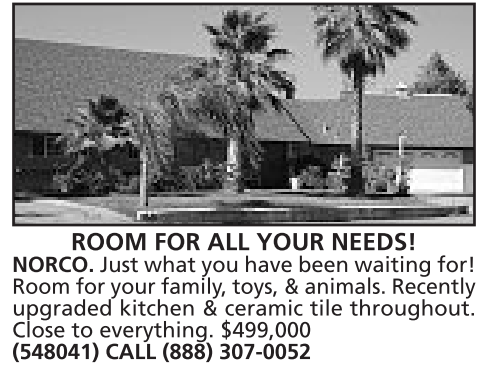 NORCO. Just whatyou have been waiting for! Room for your family,toys, &animals. Recently upgraded kitchen & ceramic tile throughout. Close to everything. $499,000 (548041) CALL (888) 307-0052