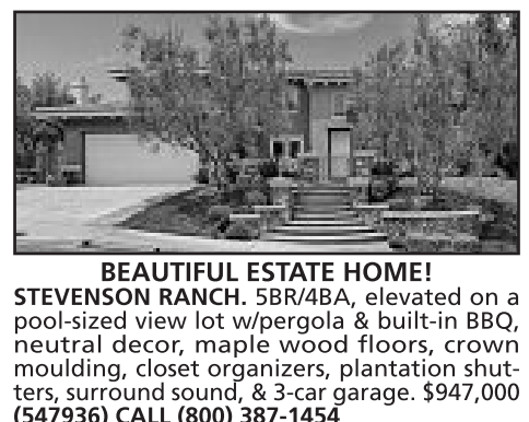 BEAUTIFUL ESTATE HOME! STEVENSON RANCH. 5BR/4BA, elevated on a pool-sized view lot w/pergola & built-in BBQ, neutral decor, maple wood floors, crown moulding, closet organizers, plantation shutters, surround sound, &3-car garage. $947,000 (547936) CALL (800) 387-1454