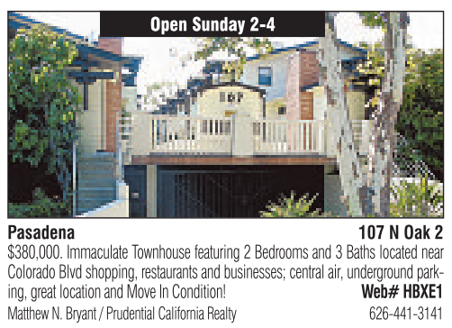 Open Sunday 2-4 Pasadena 107 NOak 2Matthew N. Bryant /Prudential California Realty 626-441-3141 Colorado Blvd shopping, restaurants and businesses; central air,underground park- $380,000. Immaculate Townhouse featuring 2Bedrooms and 3Baths located near ing, great location and Move In Condition! Web# HBXE1