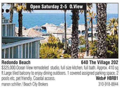 Open Saturday 2-5 O.View Redondo Beach 640 The Village 202 manon schiller /Beach City Brokers 310-918-8844 ft.Large tiled balcony to enjoy dining outdoors. 1covered assigned parking space, 2 $325,000.Ocean View remodeled studio, full size kitchen, full bath. Approx. 410 sq pools etc, pet friendly.Coastal access. Web# HBRB1