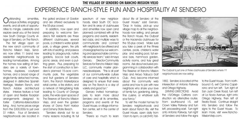 amenities, unique activities, engaging events, and all sorts of opportunities to mingle, celebrate and explore await you at the brand new South Orange County village of Sendero, on The Ranch.