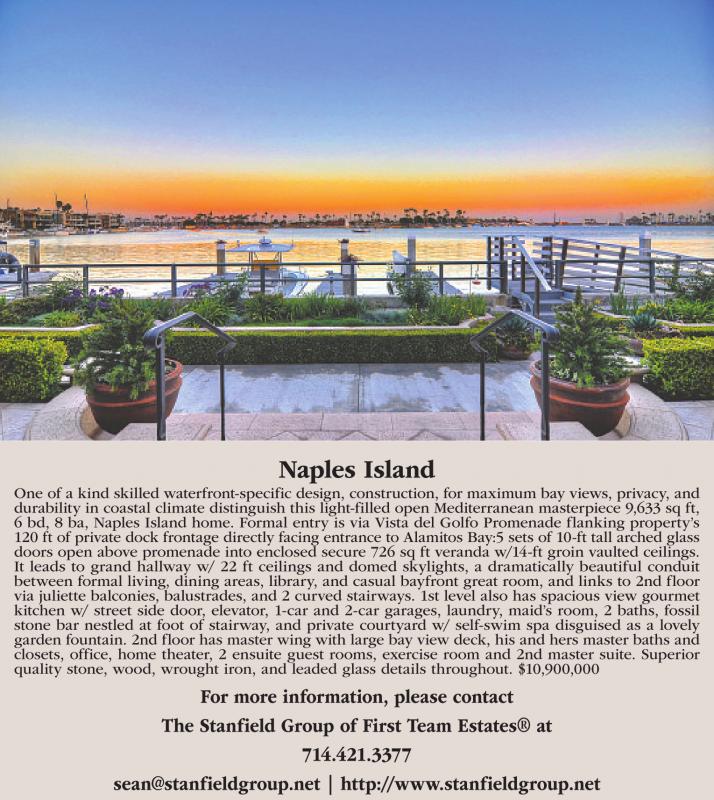 6 bd, 8 ba, Naples Island home. Formal entry is via Vista del Golfo Promenade flanking property’s