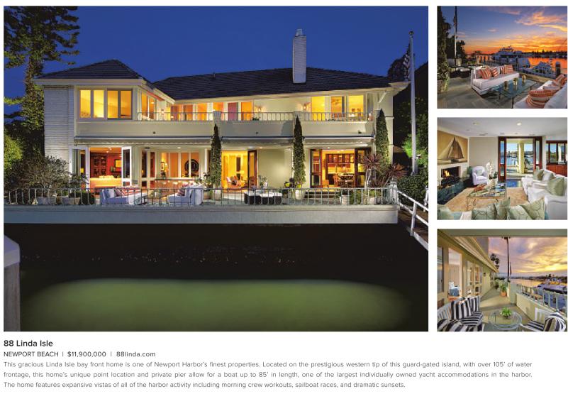 NEWPORT BEACH | $11,900,000 | 88linda.com This gracious Linda Isle bay front home is one of Newport Harbor’s finest properties. Located on the prestigious western tip of this guard-gated island, with over 105’ of water frontage, this home’s unique point location and private pier allow for a boat up to 85’ in length, one of the largest individually owned yacht accommodations in the harbor. The home features expansive vistas of all of the harbor activity including morning crew workouts, sailboat races, and dramatic sunsets.