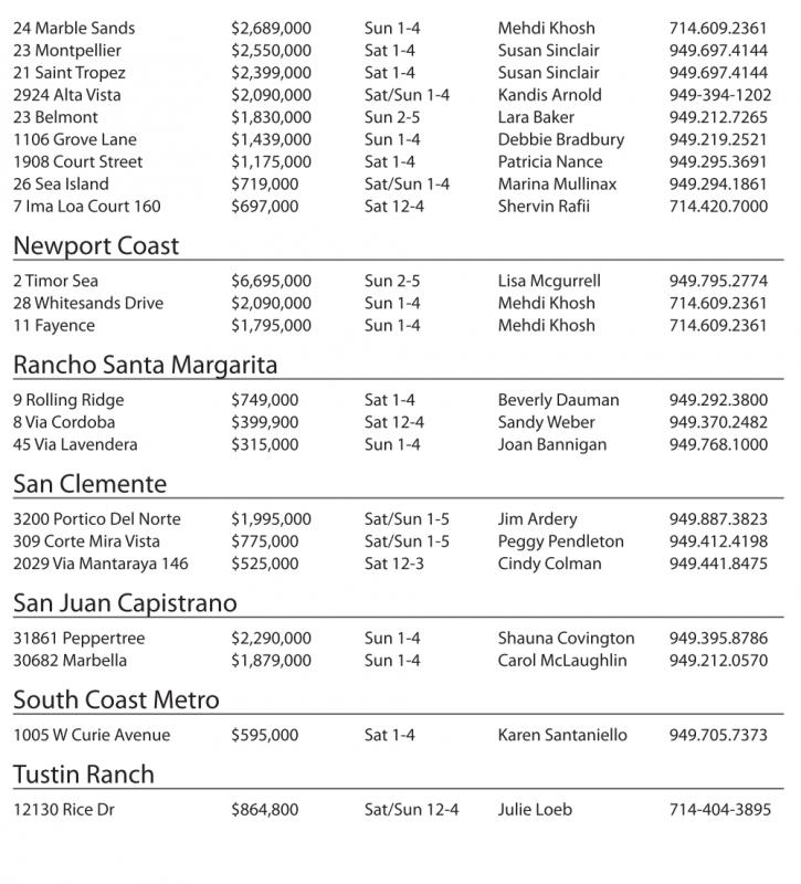 24 Marble Sands $2,689,000 Sun 1-4 Mehdi Khosh 714.609.2361 23 Montpellier $2,550,000 Sat 1-4 Susan Sinclair 949.697.4144 21 Saint Tropez $2,399,000 Sat 1-4 Susan Sinclair 949.697.4144 2924 Alta Vista $2,090,000 Sat/Sun 1-4 Kandis Arnold 949-394-1202 23 Belmont $1,830,000 Sun 2-5 Lara Baker 949.212.7265 1106 GroveLane $1,439,000 Sun 1-4 Debbie Bradbury 949.219.2521 1908 CourtStreet $1,175,000 Sat 1-4 Patricia Nance 949.295.3691 26 SeaIsland $719,000 Sat/Sun 1-4 Marina Mullinax 949.294.1861 7Ima LoaCourt160 $697,000 Sat 12-4 Shervin Rafii 714.420.7000