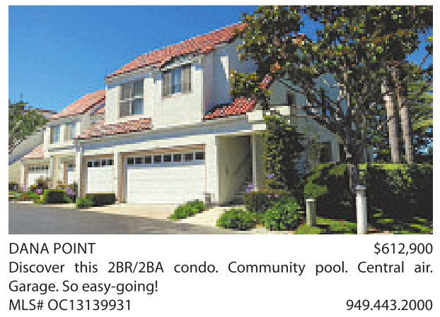 DANA POINT $612,900 Discover this 2BR/2BA condo. Community pool. Central air. Garage.Soeasy-going! MLS#OC13139931 949.443.2000
