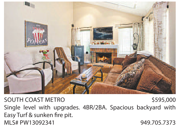 SOUTH COAST METRO $595,000 Single level with upgrades. 4BR/2BA. Spacious backyard with Easy Turf &sunken firepit. MLS# PW13092341 949.705.7373