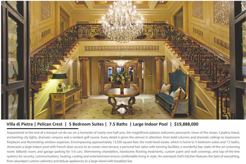 Sequestered at the end of a tranquil cul-de-sac on a homesite of nearly one-half acre, the magnificent palazzo welcomes panoramic views of the ocean, Catalina Island, enchanting city lights, dramatic canyons and a verdant golf course. Every detail is given the utmost in attention, from bold columns and dramatic ceilings to impressive fireplaces and illuminating window expanses. Encompassing approximately 13,500 square feet, the multi-level estate, which is home to 5 bedroom suites and 7.5 baths, showcases a large indoor pool with French door access to an ocean-view terrace; a personal hair salon with tanning facilities; a wonderful bar; state-of-the-art screening room; billiards room; and garage parking for 5-6 cars. Shimmering chandeliers, handsome flooring treatments, custom paint and wall coverings, and top-of-the-line systems for security, communications, heating, cooling and entertainment ensure comfortable living in style. An oversized chef’s kitchen features the best of everything, from abundant custom cabinetryand deluxeappliances to alarge island with breakfast bar.