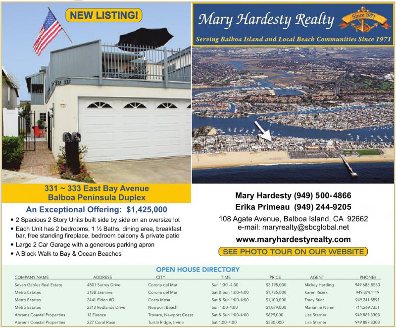 COMPANY NAME ADDRESS CITY TIME PRICE AGENT PHONE# Seven Gables Real Estate 4801 Surrey Drive Corona del Mar Sun 1:30 -4:30 $3,195,000 Mickey Hartling 949.683.5553 Metro Estates 318B Jasmine Corona del Mar Sat &Sun 1:00-4:00 $1,735,000 Karen Rezek 949.874.1119 Metro Estates 2441 Elden #D Costa Mesa Sat &Sun 1:00-4:00 $1,100,000 Tracy Stier 949.241.5591 Metro Estates 2313 Redlands Drive Newport Beach Sun 1:00-4:00 $1,079,000 Marianne Nahin 714.269.7351 Abrams Coastal Properties 12Firenze Trovare, Newport Coast Sat &Sun 1:00-4:00 $899,000 Lisa Starner 949.887.8303 Abrams Coastal Properties 227 Coral Rose Turtle Ridge, Irvine Sat 1:00-4:00 $530,000 Lisa Starner 949.887.8303