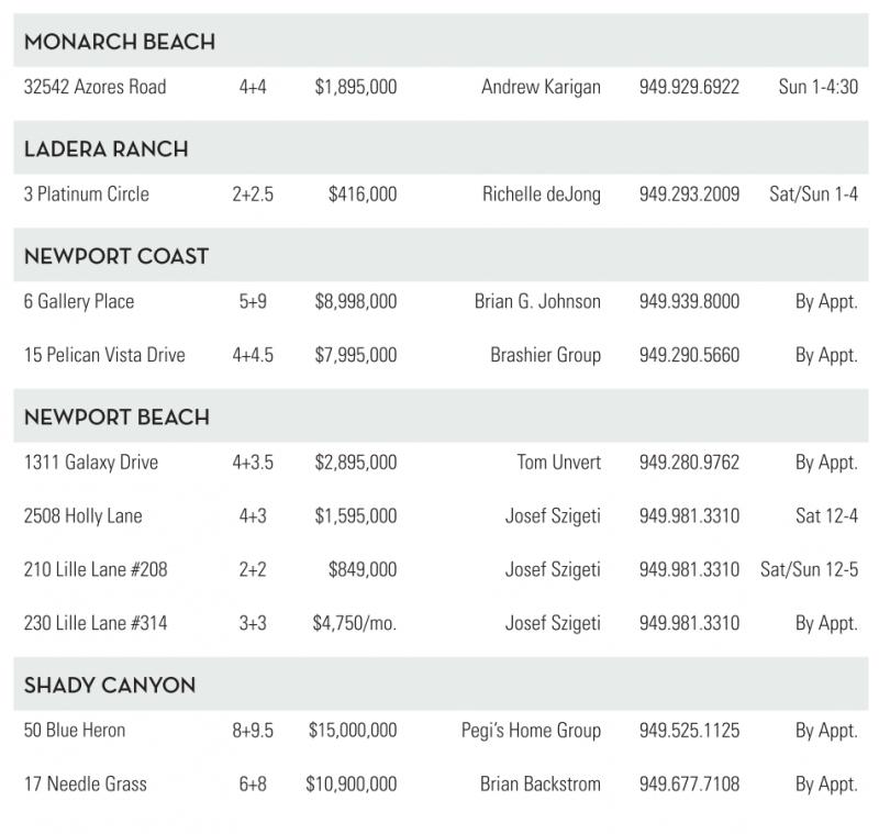 MONARCH BEACH 32542 Azores Road 4+4 $1,895,000 Andrew Karigan 949.929.6922 Sun 1-4:30 DERARANCH 3Platinum Circle 2+2.5 $416,000 Richelle deJong 949.293.2009 Sat/Sun 1-4 NEWPORTCOAST 6Gallery Place 5+9 $8,998,000 Brian G. Johnson 949.939.8000 By Appt. 15 Pelican Vista Drive 4+4.5 $7,995,000 Brashier Group 949.290.5660 By Appt. NEWPORTBEACH 1311 Galaxy Drive 4+3.5 $2,895,000 TomUnvert 949.280.9762 By Appt. 2508 Holly Lane 4+3 $1,595,000 Josef Szigeti 949.981.3310 Sat 12-4 210 Lille Lane #208 2+2 $849,000 Josef Szigeti 949.981.3310 Sat/Sun 12-5 230 Lille Lane #314 3+3 $4,750/mo. Josef Szigeti 949.981.3310 By Appt. SHADYCANYON 50 Blue Heron 8+9.5 $15,000,000 Pegi’sHome Group 949.525.1125 By Appt. 17 Needle Grass 6+8 $10,900,000 Brian Backstrom 949.677.7108 By Appt.