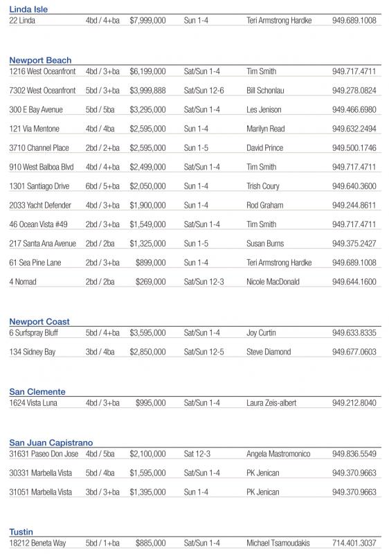 Newport Beach 1216 West Oceanfront 4bd /3+ba $6,199,000 Sat/Sun 1-4 TimSmith 949.717.4711 7302 West Oceanfront 5bd /3+ba $3,999,888 Sat/Sun 12-6 Bill Schonlau 949.278.0824 300 EBay Avenue 5bd /5ba $3,295,000 Sat/Sun 1-4 Les Jenison 949.466.6980 121 Via Mentone 4bd /4ba $2,595,000 Sun 1-4 Marilyn Read 949.632.2494 3710 Channel Place 2bd /2+ba $2,595,000 Sun 1-5 David Prince 949.500.1746 910 West Balboa Blvd 4bd /4+ba $2,499,000 Sat/Sun 1-4 TimSmith 949.717.4711 1301 Santiago Drive 6bd /5+ba $2,050,000 Sun 1-4 Trish Coury 949.640.3600 2033 Yacht Defender 4bd /3+ba $1,900,000 Sun 1-4 Rod Graham 949.244.8611 46 Ocean Vista #49 2bd /3+ba $1,549,000 Sat/Sun 1-4 TimSmith 949.717.4711 217 Santa Ana Avenue 2bd /2ba $1,325,000 Sun 1-5 Susan Burns 949.375.2427 61 Sea Pine Lane 2bd /3+ba $899,000 Sun 1-4 Teri Armstrong Hardke 949.689.1008 4Nomad 2bd /2ba $269,000 Sat/Sun 12-3 Nicole MacDonald 949.644.1600