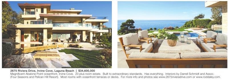 2675 Riviera Drive, Irvine Cove, Laguna Beach | $34,600,000 Magnificent Abalone Point oceanfront, Irvine Cove. 20 plus room estate. Built to extraordinary standards. Has everything. Interiors by Darrell Schmidt and Assoc. (Four Seasons and Pelican Hill Resort). Most rooms with oceanfront terraces or decks. For more info and photos see www.2675rivieradrive.com or www.roddaley.com. See also