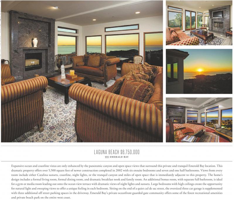 50 LAGUNA BEACH $6,750,000 555 emerald bay Expansive ocean and coastline vistas are only enhanced by the panoramic canyon and open space views that surround this private and tranquil Emerald Bay location. This dramatic property offers over 5,500 square feet of newer construction completed in 2002 with six ensuite bedrooms and seven and one half bathrooms. Views from every room include either Catalina sunsets, coastline, night lights, or the tranquil canyon and miles of open space that is immediately adjacent to this property. The home’s design includes a formal living room, formal dining room, and dramatic breakfast nook and family room. An additional bonus room, with separate full bathroom, is ideal for a gym or media room leading out onto the ocean view terrace with dramatic views of night lights and sunsets. Large bedroomswith high ceilings create the opportunity for natural light and sweeping views to offer a unique feeling in each bedroom. Sitting on the end of a quiet cul de sac street, the oversized three car garage is supplemented with three additional off street parking spaces in the driveway. Emerald Bay’s private oceanfront guarded gate community offers some of the finest recreational amenities and private beach park on the entire west coast.