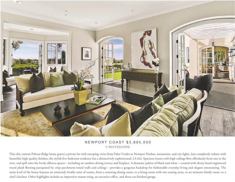 This chic custom Pelican Ridge home graces a private lot with sweeping views from Palos Verdes to Newport Harbor, mountains, and city lights. Just completely redone with beautiful, high-quality finishes, the stylish five-bedroom residence has a distinctively sophisticated, LA feel. Spacious rooms with high ceilings flow effortlessly from one to the next, and spill onto the lovely alfresco spaces – including an outdoor dining terrace and fireplace. A dramatic palette of black and white – created with ebony-hued engineered wood plank flooring juxtaposed by crisp parchment-toned walls and ceilings – provides a gorgeous backdrop for fashionable everyday living and elegant entertaining. The main level of the home features an eminently livable suite of rooms, from a stunning dining room, to a living room with two seating areas, to an intimate family room, to a chef’s kitchen. Other highlights include an impressive master wing, an executive office, and three-car finished garage.