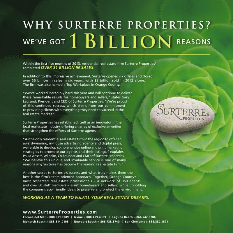 In addition to this impressive achievement, Surterre opened six offices and closed over $6 billion in sales in six years, with $2 billion sold in 2012 alone. The firm was also named a Top Workplace in Orange County.