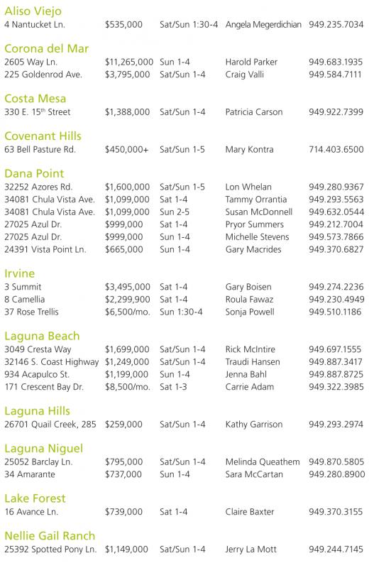 3049 Cresta Way $1,699,000 Sat/Sun 1-4 Rick McIntire 949.697.1555 32146 S. Coast Highway $1,249,000 Sat/Sun 1-4 Traudi Hansen 949.887.3417 934 Acapulco St. $1,199,000 Sun 1-4 Jenna Bahl 949.887.8725 171 Crescent Bay Dr. $8,500/mo. Sat 1-3 Carrie Adam 949.322.3985