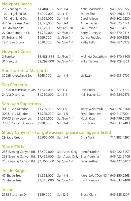 29 Gleneagles Dr. $4,400,000 Sun 1-4 Katie Machoskie 949.355.9722 1701 Highland Dr. $1,999,000 Sat 1-4 Esther Fine 949.466.6483 1701 Highland Dr. $1,999,000 Sun 1-4 Carol Allison 949.302.0220 434 Santa Ana Ave. $1,595,000 Sun 1-4 Amie Raiger 949.375.4171 310 Alvarado Pl. $1,575,000 Sat 12-3:30 Paul Trainor 949.813.4776 27 Southampton Ct. $1,239,000 Sat/Sun 1-4 Betty Comegys 949.370.0516 31 Brittany, 16 $669,000 Sat/Sun 1-4 Donna Peebles 949.500.1858 1951 San Bruno $630,000 Sat/Sun 1-4 Kathy Fallon 949.887.0972