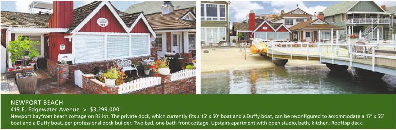 NEWPORT BEACH 419 E. Edgewater Avenue > $3,299,000 Newport bayfront beach cottage on R2 lot. The private dock, which currently fits a 15’ x 50’ boat and a Duffy boat, can be reconfigured to accommodate a 17’ x 55’ boat and a Duffy boat, per professional dock builder. Two bed, one bath front cottage. Upstairs apartment with open studio, bath, kitchen. Rooftop deck.