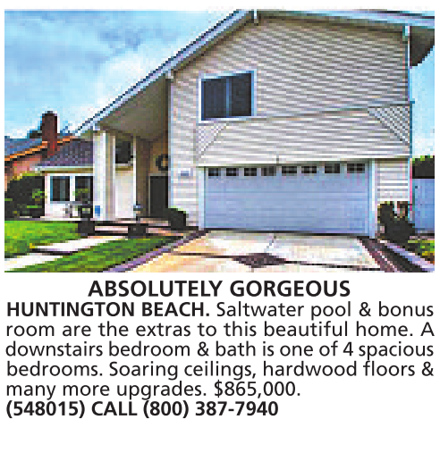 ABSOLUTELY GORGEOUS HUNTINGTON BEACH. Saltwater pool & bonus room are the extras to this beautiful home. A downstairs bedroom &bath is one of 4spacious bedrooms. Soaring ceilings, hardwood floors & many more upgrades. $865,000. (548015) CALL (800) 387-7940