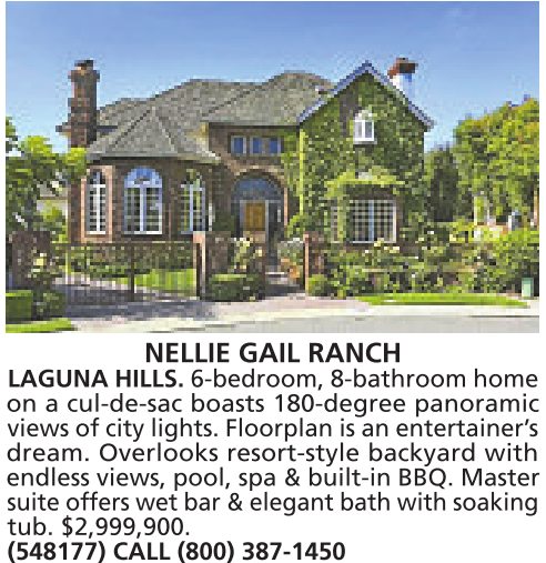 NELLIE GAIL RANCH LAGUNA HILLS. 6-bedroom, 8-bathroom home on a cul-de-sac boasts 180-degree panoramic views of city lights. Floorplan is an entertainer’s dream. Overlooks resort-style backyard with endless views, pool, spa & built-in BBQ. Master suite offers wet bar &elegant bath with soaking tub. $2,999,900. (548177) CALL (800) 387-1450 See also