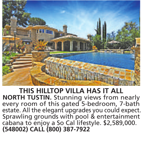THIS HILLTOP VILLA HAS IT ALL NORTH TUSTIN. Stunning views from nearly every room of this gated 5-bedroom, 7-bath estate. All the elegant upgrades you could expect. Sprawling grounds with pool & entertainment cabana to enjoy a So Cal lifestyle. $2,589,000. (548002) CALL (800) 387-7922