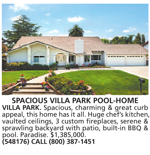 SPACIOUS VILLA PARK POOL-HOME VILLA PARK. Spacious, charming & great curb appeal, this home has it all. Huge chef’skitchen, vaulted ceilings, 3 custom fireplaces, serene & sprawling backyard with patio, built-in BBQ & pool. Paradise. $1,385,000. (548176) CALL (800) 387-1451