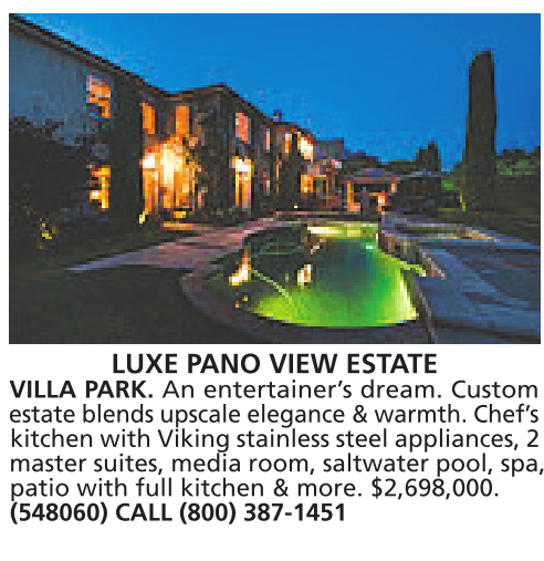 LUXE PANO VIEW ESTATE VILLA PARK. An entertainer’s dream. Custom estate blends upscale elegance &warmth. Chef’s kitchen with Viking stainless steel appliances, 2 master suites, media room, saltwater pool, spa, patio with full kitchen & more. $2,698,000. (548060) CALL (800) 387-1451