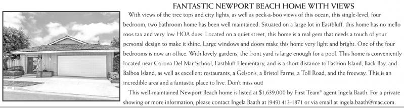This well-maintained Newport Beach home is listed at $1,639,000 by First Team ® agent Ingela Baath. For a private