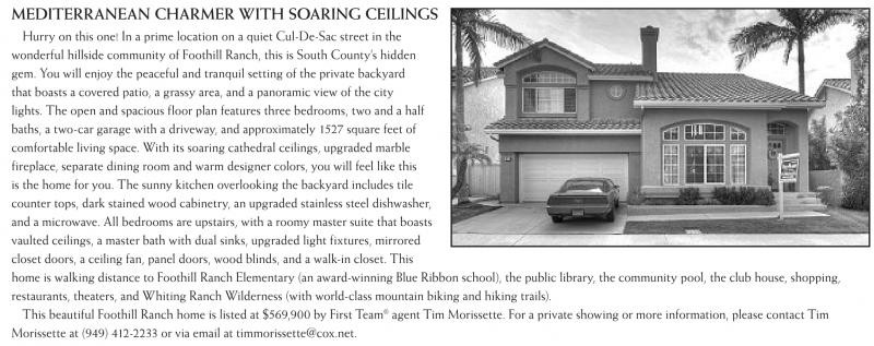This beautiful Foothill Ranch home is listed at $569,900 by First Team ® agent Tim Morissette. For a private showing or more information, please contact Tim Morissette at (949) 412-2233 or via email at timmorissette@cox.net.