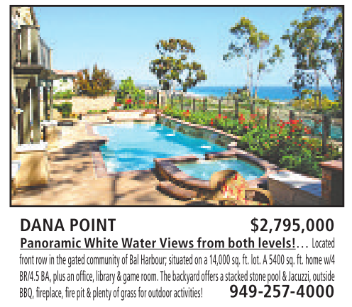 DANA POINT $2,795,000 Panoramic WhiteWater Viewsfrombothlevels!… Located front row in the gated community ofBal Harbour; situated ona14,000 sq. ft. lot. A5400 sq. ft. home w/4 BR/4.5 BA,plusanoffice,library &game room. Thebackyard offersastacked stone pool&Jacuzzi, outside BBQ,fireplace,fire pit &plentyofgrassfor outdooractivities! 949-257-4000