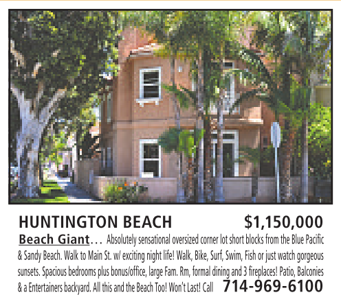 HUNTINGTON BEACH $1,150,000 Beach Giant… Absolutely sensational oversized corner lot short blocks from the Blue Pacific &Sandy Beach. Walk to Main St. w/exciting night life! Walk, Bike, Surf, Swim, Fish orjust watch gorgeous sunsets. Spacious bedrooms plus bonus/office, large Fam. Rm, formal dining and 3fireplaces! Patio, Balconies &aEntertainersbackyard. Allthis andthe Beach Too! Won’tLast! Call 714-969-6100