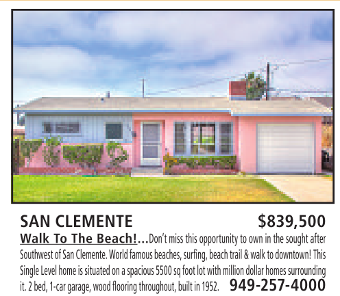 SAN CLEMENTE $839,500 Walk To The Beach!...Don’t miss this opportunity toown in the sought after SouthwestofSan Clemente.World famous beaches, surfing,beachtrail&walk to downtown!This SingleLevel home is situated on aspacious 5500 sq foot lotwithmillion dollarhomessurrounding it.2bed, 1-cargarage, wood flooringthroughout,built in 1952. 949-257-4000
