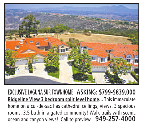 EXCLUSIVE LAGUNA SUR TOWNHOME ASKING: $799-$839,000 Ridgeline View 3bedroom spilt levelhome... This immaculate home onacul-de-sac has cathedral ceilings, views, 3spacious rooms, 3.5 bath inagated community! Walk trails with scenic ocean andcanyonviews! Calltopreview 949-257-4000