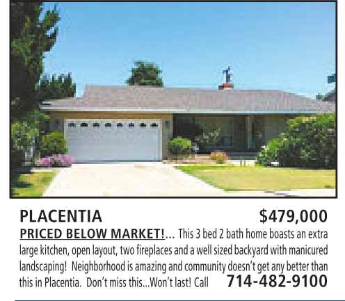 PLACENTIA $479,000 PRICED BELOW MARKET!... This 3bed 2bathhome boasts an extra large kitchen,openlayout,two fireplacesand awellsizedbackyard with manicured landscaping! Neighborhood is amazingand communitydoesn’tget anybetter than this in Placentia. Don’t missthis...Won’tlast! Call 714-482-9100