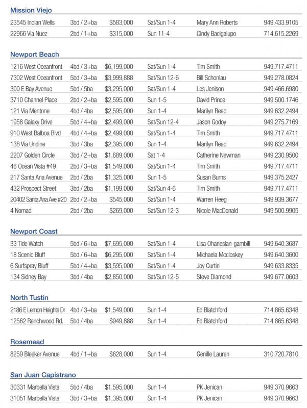23545 Indian Wells 3bd /2+ba $583,000 Sat/Sun 1-4 MaryAnn Roberts 949.433.9105 22966 Via Nuez 2bd /1+ba $315,000 Sun 11-4 Cindy Bacigalupo 714.615.2269 Newport Beach 1216 West Oceanfront 4bd /3+ba $6,199,000 Sat/Sun 1-4 TimSmith 949.717.4711 7302 West Oceanfront 5bd /3+ba $3,999,888 Sat/Sun 12-6 Bill Schonlau 949.278.0824 300 EBay Avenue 5bd /5ba $3,295,000 Sat/Sun 1-4 Les Jenison 949.466.6980 3710 Channel Place 2bd /2+ba $2,595,000 Sun 1-5 David Prince 949.500.1746 121 Via Mentone 4bd /4ba $2,595,000 Sun 1-4 Marilyn Read 949.632.2494 1958 Galaxy Drive 5bd /4+ba $2,499,000 Sat/Sun 12-4 Jason Godoy 949.275.7169 910 West Balboa Blvd 4bd /4+ba $2,499,000 Sat/Sun 1-4 TimSmith 949.717.4711 138 Via Undine 3bd /3ba $2,395,000 Sun 1-4 Marilyn Read 949.632.2494 2207 Golden Circle 3bd /2+ba $1,689,000 Sat 1-4 Catherine Newman 949.230.9500 46 Ocean Vista #49 2bd /3+ba $1,549,000 Sat/Sun 1-4 TimSmith 949.717.4711 217 Santa Ana Avenue 2bd /2ba $1,325,000 Sun 1-5 Susan Burns 949.375.2427 432 Prospect Street 3bd /2ba $1,199,000 Sat/Sun 4-6 TimSmith 949.717.4711 20402 Santa Ana Ave#20 2bd /2+ba $545,000 Sat/Sun 1-4 Warren Heeg 949.939.3677 4Nomad 2bd /2ba $269,000 Sat/Sun 12-3 Nicole MacDonald 949.500.9905