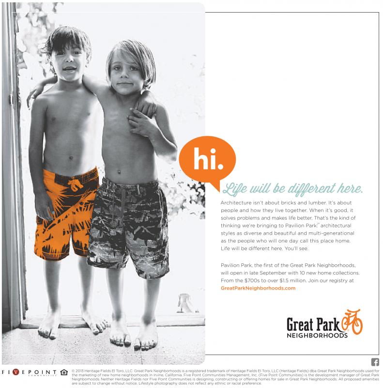 ©2013 Heritage Fields El Toro,LLC.Great Park Neighborhoods is aregisteredtrademark of Heritage Fields El Toro,LLC (Heritage Fields)dba Great Park Neighborhoods used for the marketing of new home neighborhoods in Irvine, California. Five Point Communities Management, Inc. (Five Point Communities) isthe development manager of Great Park Neighborhoods. Neither Heritage Fields nor Five Point Communities is designing, constructing or offering homes for sale in Great Park Neighborhoods. All proposed amenities are subject to change without notice. Lifestyle photography does not reflect any ethnic or racial preference.