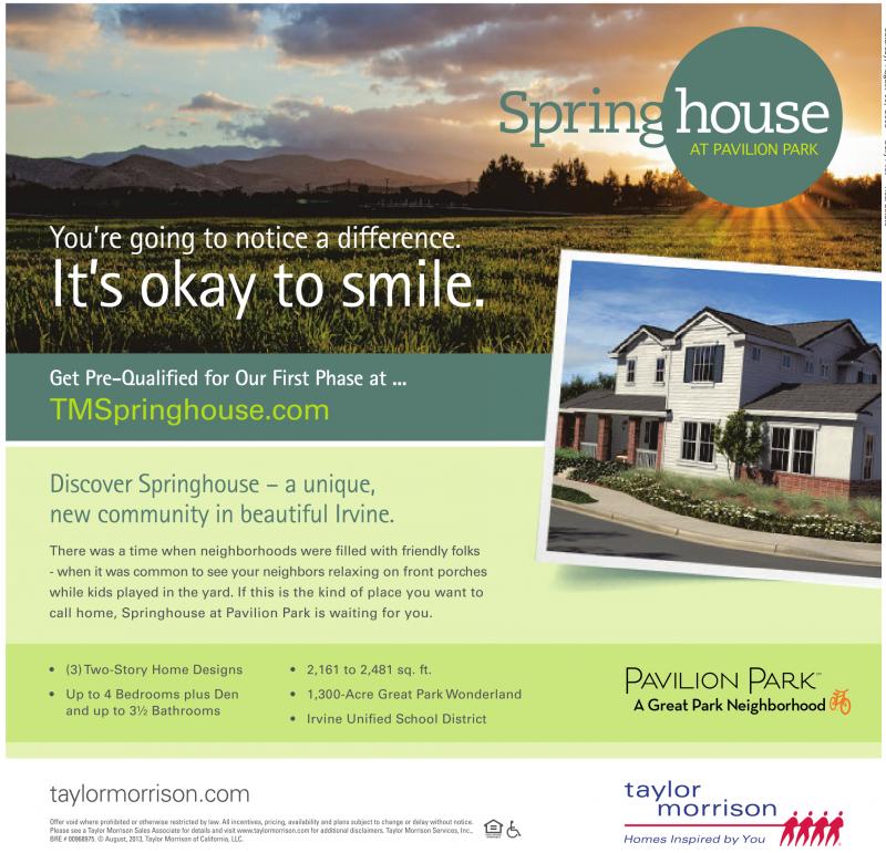 You’re going to notice a difference. It’s okay to smile. Get Pre-Qualified for Our First Phase at ... TMSpringhouse.com Discover Springhouse – a unique, new community in beautiful Irvine. There was a time when neighborhoods were filled with friendly folks - when it was common to see your neighbors relaxing on front porches while kids played in the yard. If this is the kind of place you want to call home, Springhouse at Pavilion Park is waiting for you. taylormorrison.com Offer void where prohibited or otherwise restricted by law.All incentives, pricing, availability and plans subject to change or delay without notice. Please see aTaylor Morrison Sales Associate for details and visit www.taylormorrison.com for additional disclaimers. Taylor Morrison Services, Inc., BRE #00968975. ©August, 2013, Taylor Morrison of California, LLC.