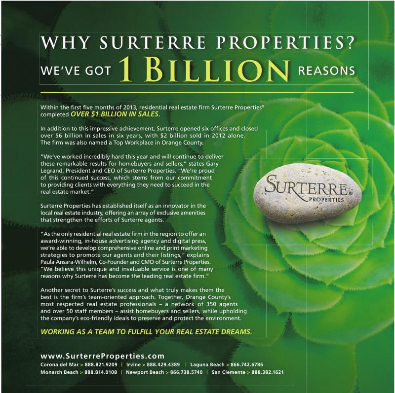 In addition to this impressive achievement, Surterre opened six offices and closed over $6 billion in sales in six years, with $2 billion sold in 2012 alone. The firm was also named a Top Workplace in Orange County.