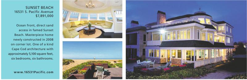 SUNSET BEACH 16531 S. Pacific Avenue $7,891,000 Ocean front, direct sand access in famed Sunset Beach. Masterpiece home newly constructed in 2008 on corner lot. One of a kind Cape Cod architecture with approximately 5,100 square feet, six bedrooms, six bathrooms. www.16531Pacific.com