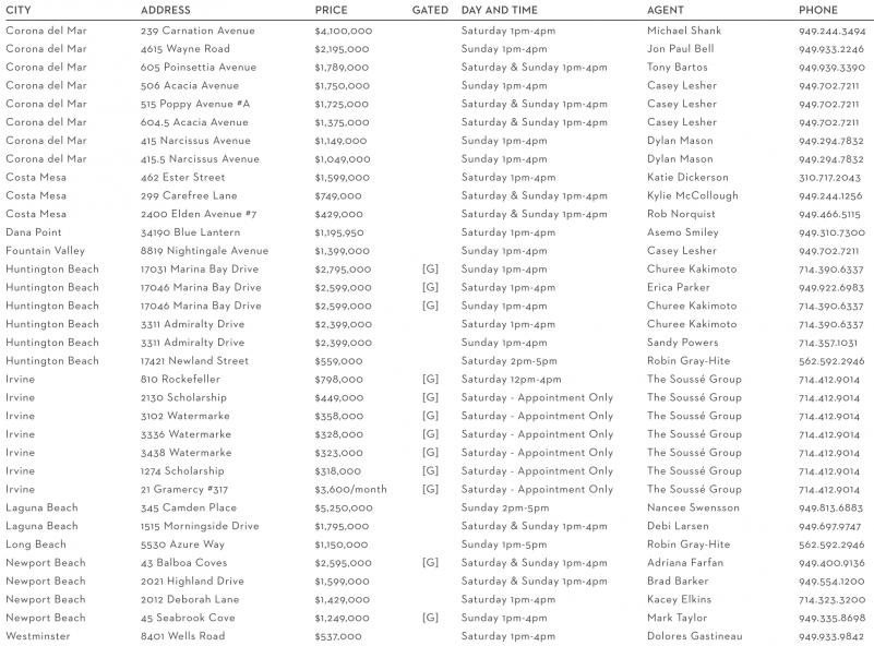 CITY ADDRESS PRICE GATED DAY AND TIME AGENT PHONE Corona del Mar 239 Carnation Avenue $4,100,000 Saturday 1pm-4pm Michael Shank 949.244.3494 Corona del Mar 4615 Wayne Road $2,195,000 Sunday 1pm-4pm Jon Paul Bell 949.933.2246 Corona del Mar 605 Poinsettia Avenue $1,789,000 Saturday & Sunday 1pm-4pm Tony Bartos 949.939.3390 Corona del Mar 506 Acacia Avenue $1,750,000 Sunday 1pm-4pm Casey Lesher 949.702.7211 Corona del Mar 515 Poppy Avenue #A $1,725,000 Saturday & Sunday 1pm-4pm Casey Lesher 949.702.7211 Corona del Mar 604.5 Acacia Avenue $1,375,000 Saturday & Sunday 1pm-4pm Casey Lesher 949.702.7211 Corona del Mar 415 Narcissus Avenue $1,149,000 Sunday 1pm-4pm Dylan Mason 949.294.7832 Corona del Mar 415.5 Narcissus Avenue $1,049,000 Sunday 1pm-4pm Dylan Mason 949.294.7832 Costa Mesa 462 Ester Street $1,599,000 Saturday 1pm-4pm Katie Dickerson 310.717.2043 Costa Mesa 299 Carefree Lane $749,000 Saturday & Sunday 1pm-4pm Kylie McCollough 949.244.1256 Costa Mesa 2400 Elden Avenue #7 $429,000 Saturday & Sunday 1pm-4pm Rob Norquist 949.466.5115 Dana Point 34190 Blue Lantern $1,195,950 Saturday 1pm-4pm Asemo Smiley 949.310.7300 Fountain Valley 8819 Nightingale Avenue $1,399,000 Sunday 1pm-4pm Casey Lesher 949.702.7211 Huntington Beach 17031 Marina Bay Drive $2,795,000 [G] Sunday 1pm-4pm Churee Kakimoto 714.390.6337 Huntington Beach 17046 Marina Bay Drive $2,599,000 [G] Saturday 1pm-4pm Erica Parker 949.922.6983 Huntington Beach 17046 Marina Bay Drive $2,599,000 [G] Sunday 1pm-4pm Churee Kakimoto 714.390.6337 Huntington Beach 3311 Admiralty Drive $2,399,000 Saturday 1pm-4pm Churee Kakimoto 714.390.6337 Huntington Beach 3311 Admiralty Drive $2,399,000 Sunday 1pm-4pm Sandy Powers 714.357.1031 Huntington Beach 17421 Newland Street $559,000 Saturday 2pm-5pm Robin Gray-Hite 562.592.2946 Irvine 810 Rockefeller $798,000 [G] Saturday 12pm-4pm The Soussé Group 714.412.9014 Irvine 2130 Scholarship $449,000 [G] Saturday - Appointment Only The Soussé Group 714.412.9014 Irvine 3102 Watermarke $358,000 [G] Saturday - Appointment Only The Soussé Group 714.412.9014 Irvine 3336 Watermarke $328,000 [G] Saturday - Appointment Only The Soussé Group 714.412.9014 Irvine 3438 Watermarke $323,000 [G] Saturday - Appointment Only The Soussé Group 714.412.9014 Irvine 1274 Scholarship $318,000 [G] Saturday - Appointment Only The Soussé Group 714.412.9014 Irvine 21 Gramercy #317 $3,600/month [G] Saturday - Appointment Only The Soussé Group 714.412.9014 Laguna Beach 345 Camden Place $5,250,000 Sunday 2pm-5pm Nancee Swensson 949.813.6883 Laguna Beach 1515 Morningside Drive $1,795,000 Saturday & Sunday 1pm-4pm Debi Larsen 949.697.9747 Long Beach 5530 Azure Way $1,150,000 Sunday 1pm-5pm Robin Gray-Hite 562.592.2946 Newport Beach 43 Balboa Coves $2,595,000 [G] Saturday & Sunday 1pm-4pm Adriana Farfan 949.400.9136 Newport Beach 2021 Highland Drive $1,599,000 Saturday & Sunday 1pm-4pm Brad Barker 949.554.1200 Newport Beach 2012 Deborah Lane $1,429,000 Saturday 1pm-4pm Kacey Elkins 714.323.3200 Newport Beach 45 Seabrook Cove $1,249,000 [G] Sunday 1pm-4pm Mark Taylor 949.335.8698 Westminster 8401 Wells Road $537,000 Saturday 1pm-4pm Dolores Gastineau 949.933.9842