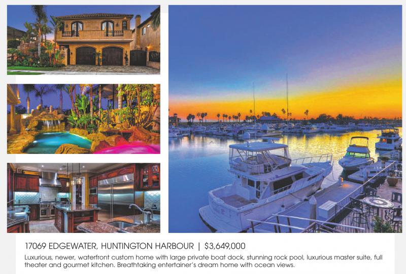 17069 EDGEWATER, HUNTINGTON HARBOUR | $3,649,000 Luxurious, newer, waterfront custom home with large private boat dock, stunning rock pool, luxurious master suite, full theater and gourmet kitchen. Breathtaking entertainer’s dream home with ocean views.