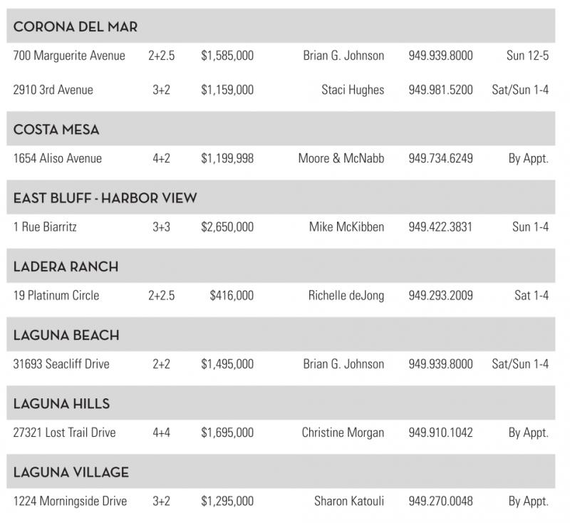 CORONA DEL MAR 700 Marguerite Avenue 2+2.5 $1,585,000 Brian G. Johnson 949.939.8000 Sun 12-5 2910 3rd Avenue 3+2 $1,159,000 Staci Hughes 949.981.5200 Sat/Sun 1-4 COSTA MESA 1654 Aliso Avenue 4+2 $1,199,998 Moore &McNabb 949.734.6249 By Appt. EASTBLUFF -HARBOR VIEW 1Rue Biarritz 3+3 $2,650,000 Mike McKibben 949.422.3831 Sun 1-4 DERARANCH 19 Platinum Circle 2+2.5 $416,000 Richelle deJong 949.293.2009 Sat 1-4 GUNA BEACH 31693 Seacliff Drive 2+2 $1,495,000 Brian G. Johnson 949.939.8000 Sat/Sun 1-4 GUNA HILLS 27321 Lost Trail Drive 4+4 $1,695,000 Christine Morgan 949.910.1042 By Appt. GUNA VIL GE 1224 Morningside Drive 3+2 $1,295,000 Sharon Katouli 949.270.0048 By Appt. See also