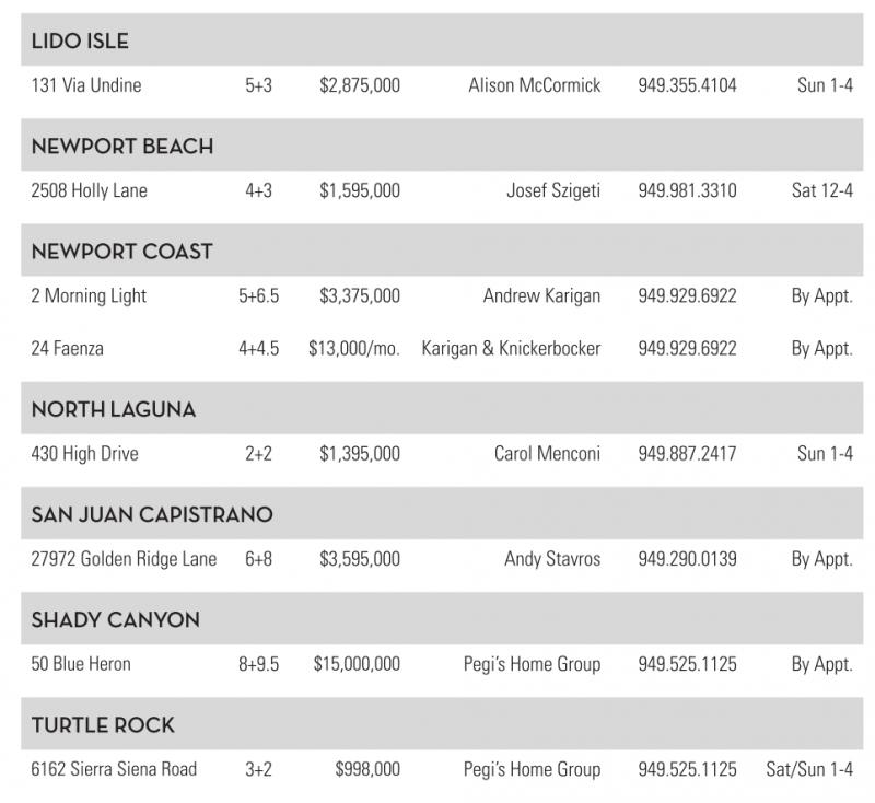 131 ViaUndine 5+3 $2,875,000 Alison McCormick 949.355.4104 Sun 1-4 NEWPORTBEACH 2508 Holly Lane 4+3 $1,595,000 Josef Szigeti 949.981.3310 Sat 12-4 NEWPORTCOAST 2Morning Light 5+6.5 $3,375,000 Andrew Karigan 949.929.6922 By Appt. 24 Faenza 4+4.5 $13,000/mo. Karigan &Knickerbocker 949.929.6922 By Appt. NORTH GUNA 430 High Drive 2+2 $1,395,000 Carol Menconi 949.887.2417 Sun 1-4 SANJUANCAPISTRANO 27972 Golden Ridge Lane 6+8 $3,595,000 Andy Stavros 949.290.0139 By Appt. SHADYCANYON 50 Blue Heron 8+9.5 $15,000,000 Pegi’sHome Group 949.525.1125 By Appt. TURTLE ROCK 6162 Sierra Siena Road 3+2 $998,000 Pegi’sHome Group 949.525.1125 Sat/Sun 1-4