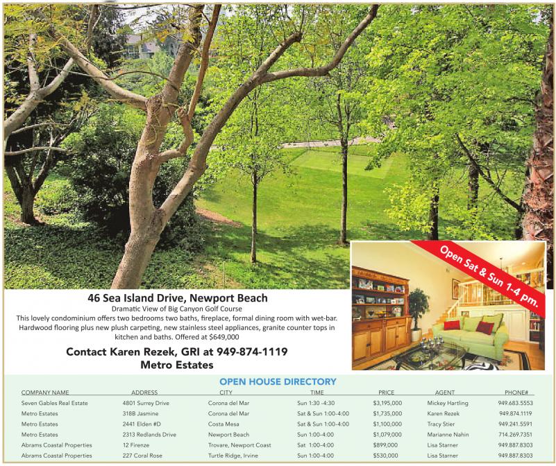 Metro Estates 318B Jasmine Corona del Mar Sat &Sun 1:00-4:00 $1,735,000 Karen Rezek 949.874.1119