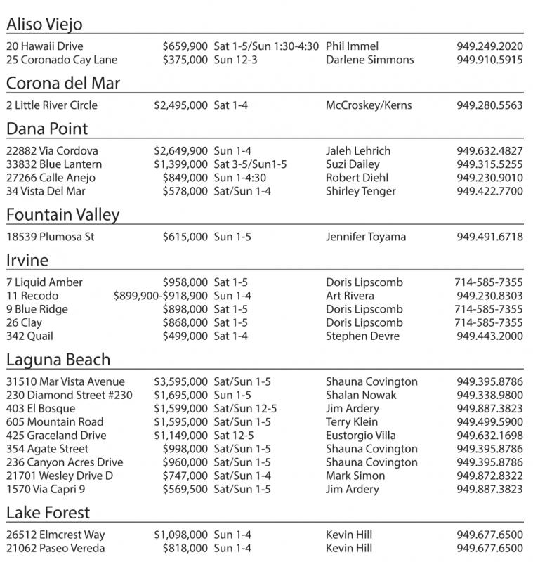 7Liquid Amber $958,000 Sat 1-5 Doris Lipscomb 714-585-7355 11 Recodo $899,900-$918,900 Sun 1-4 ArtRivera 949.230.8303 9Blue Ridge $898,000 Sat 1-5 Doris Lipscomb 714-585-7355 26 Clay $868,000 Sat 1-5 Doris Lipscomb 714-585-7355 342 Quail $499,000 Sat 1-4 Stephen Devre 949.443.2000