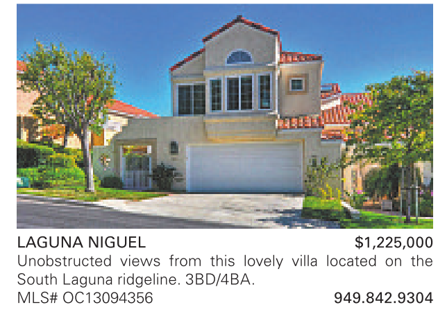 LAGUNA NIGUEL $1,225,000 Unobstructed views from this lovely villa located on the South Laguna ridgeline. 3BD/4BA. MLS# OC13094356 949.842.9304