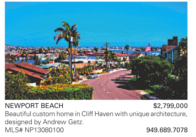 NEWPORT BEACH $2,799,000 Beautiful custom home in CliffHavenwith unique architecture, designed by Andrew Getz. MLS# NP13080100 949.689.7078